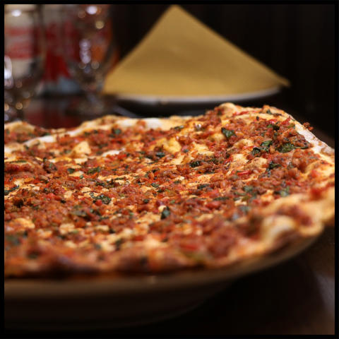 Thin crusty dough topped with cheese and sucuk (Turkish pepperoni)